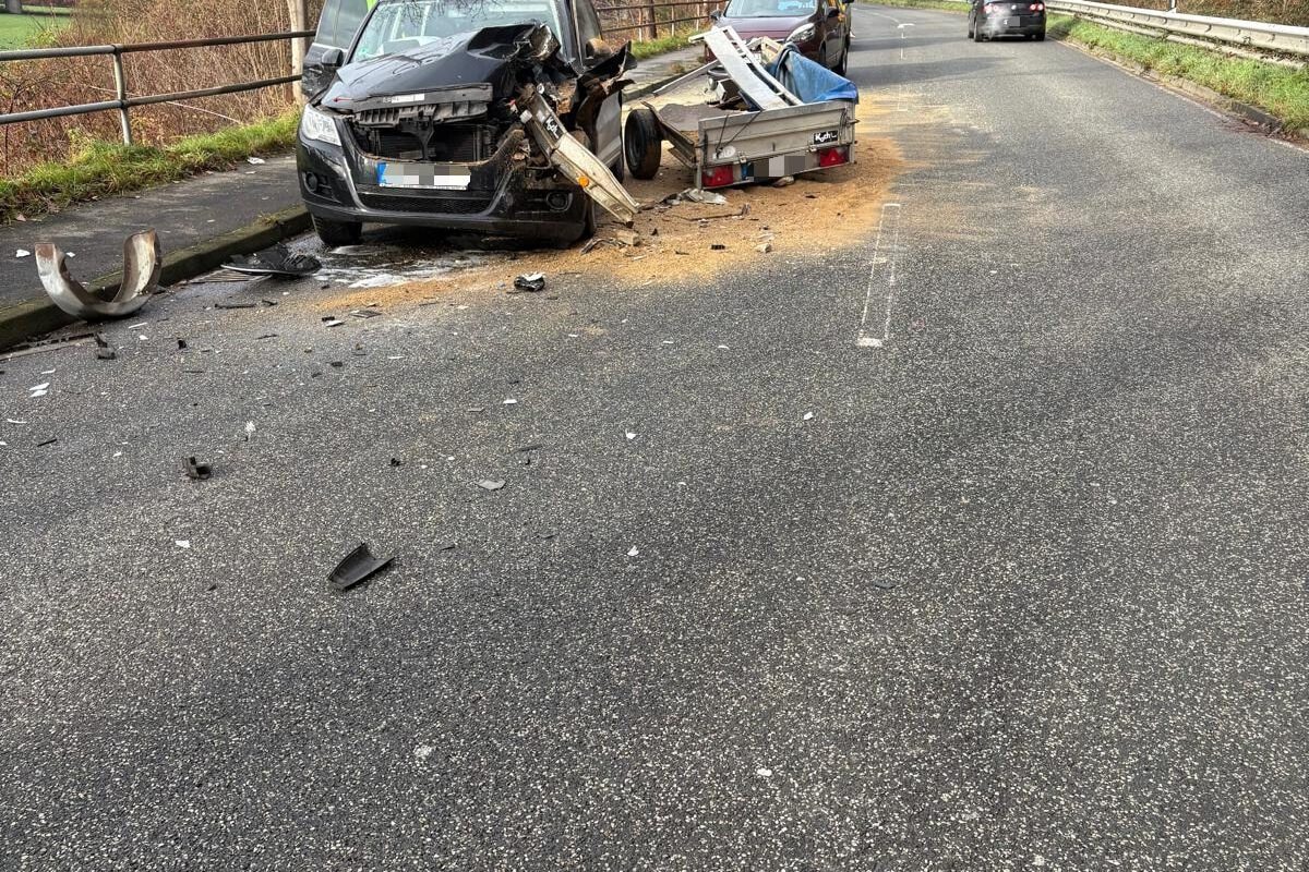 Auf der B256 zwischen Rosbach und dem Kreisverkehr Präsidentenbrücke kam es heute zu einem Verkehrsunfall mit einem PKW und einem PKW-Anhänger. Die Ladung des Anhängers verteilte sich auf einer Fahrbahnhälfte und blockierte den Verkehr.