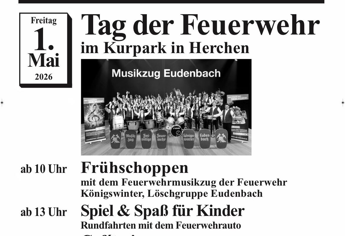 Am Freitag, den 1. Mai 2026, lädt die Freiwillige Feuerwehr Windeck – Löschzug Herchen herzlich zum Tag der Feuerwehr in den Kurpark Herchen ein.
